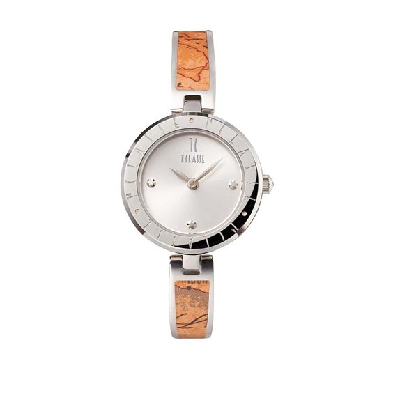 Orologio ALVIERO MARTINI Samos - Il bracciale semi bangle è in acciaio inossidabile 316L ed è caratterizzato da un inserto in pelle stampa Geo Map, con una chiusura a gioielleria.