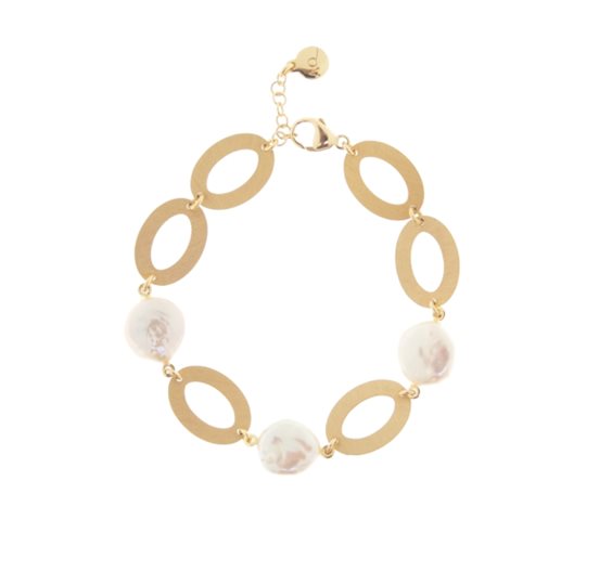 Bracciale con tre perle barocche ed elementi ovali a lastra spazzolati in AG 925‰ placcato oro giallo 23 ct. argento 925‰ placcatura in oro giallo 23 carati rivestimento con speciale trattamento che protegge dalla naturale ossidazione del metallo orgogliosamente fatto a mano in Italia placcature rigorosamente senza alcun rilascio di nichel e cadmio comfort fit