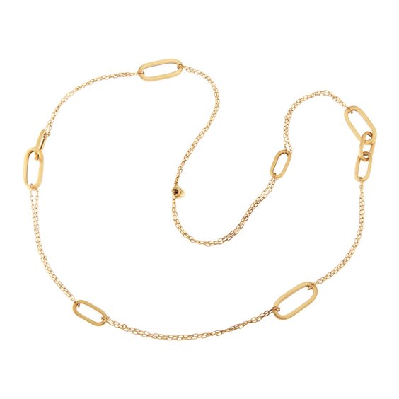 Collana lunga in AG 925‰ placcato oro giallo 23 kt. con doppia catena ed elementi ovali in canna vuota. Cm. 95 argento 925/000 placcatura in oro giallo 23 carati rivestimento con speciale trattamento che protegge dalla naturale ossidazione del metallo orgogliosamente fatto a mano in Italia placcature rigorosamente senza alcun rilascio di nichel e cadmio comfort fit