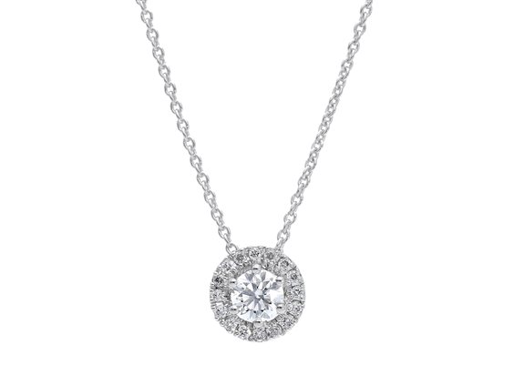 Collana punto luce in oro bianco con diamante centrale di caratura 0.20 di colore G e purezza SI e contorno di diamanti di caratura 0.06 di colore G/H di purezza SI.
