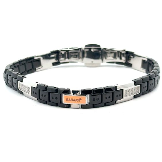Bracciale in Oro rosa 750‰ e Ceramica nera Hi-Tech, impreziosito da Diamanti neri P.Ct 18. Chiusura in Acciaio inossidabile.