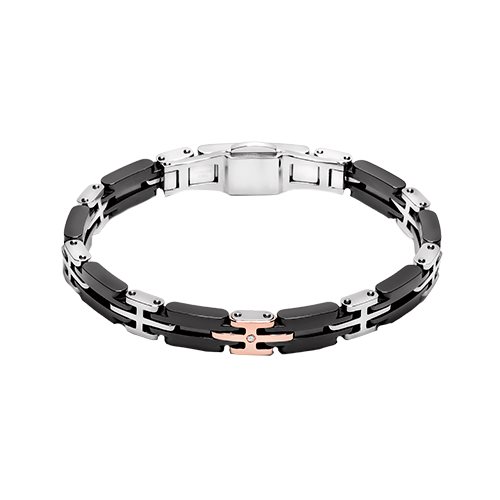 Bracciale in ceramica nera e acciao inossidabile con inserto in oro rosa e diamanti bianchi per una caratura totale di 0,04 ct.