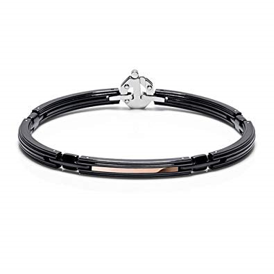 Barakà, storico marchio di gioielleria nato negli anni Sessanta, è oggi un brand affermato di gioielli di lusso per l’uomo ad alto contenuto tecnico e ingegneristico. L’universo dei valori di Barakà si esprime in gioielli interamente realizzati in Italia che uniscono lusso e innovazione, eleganza e cura del dettaglio, e in collezioni tematiche che raccontano storie di conquiste, di avventure e di icone del design italiano reinterpretate nell’alta gioielleria. Lo stile dell’uomo Barakà raccoglie tutti questi valori declinati nei tre mondi che lo vedono protagonista: business, tempo libero e svago. Lo stile dell’uomo Barakà raccoglie tutti questi valori declinati nei tre mondi che lo vedono protagonista: business, tempo libero e svago. Perché l’uomo Barakà si divide tra importanti incontri business, serate di gala e appuntamenti esclusivi e ama dedicare il suo tempo libero a hobby e sport raffinati dal sapore di altri tempi, come la vela o le macchine d’epoca. Il filo conduttore di questi momenti di vita, rimane il lusso distintivo e il design riconoscibile dei gioielli Barakà: avanguardia produttiva e artigianalità orafa 100% Made in Italy. Bracciale in oro rosa 750‰, ceramica nera, acciaio inossidabile e PVD nero. Diamante bianco P.Ct 2.