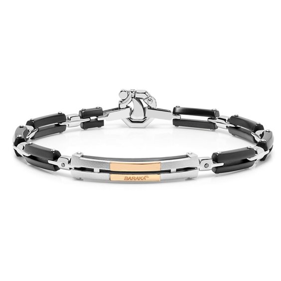 Barakà, storico marchio di gioielleria nato negli anni Sessanta, è oggi un brand affermato di gioielli di lusso per l’uomo ad alto contenuto tecnico e ingegneristico. L’universo dei valori di Barakà si esprime in gioielli interamente realizzati in Italia che uniscono lusso e innovazione, eleganza e cura del dettaglio, e in collezioni tematiche che raccontano storie di conquiste, di avventure e di icone del design italiano reinterpretate nell’alta gioielleria. Lo stile dell’uomo Barakà raccoglie tutti questi valori declinati nei tre mondi che lo vedono protagonista: business, tempo libero e svago. Lo stile dell’uomo Barakà raccoglie tutti questi valori declinati nei tre mondi che lo vedono protagonista: business, tempo libero e svago. Perché l’uomo Barakà si divide tra importanti incontri business, serate di gala e appuntamenti esclusivi e ama dedicare il suo tempo libero a hobby e sport raffinati dal sapore di altri tempi, come la vela o le macchine d’epoca. Il filo conduttore di questi momenti di vita, rimane il lusso distintivo e il design riconoscibile dei gioielli Barakà: avanguardia produttiva e artigianalità orafa 100% Made in Italy. Questo realizzato con combinazione di diversi tipi di materiali; impreziositi da una stupenda pietra luminosa. Il bracciale è costituito da una struttura con componenti che su due linee realizzate in acciaio con rifinitura in PVD Nero, alternate a parti in acciaio argentate in modo da agganciarle. Il dorso del bracciale è costituito da una parte in argento 925‰ satinato e posta sopra una placchetta in oro rosa 750‰ con impresso il marchio Barakà. Chiusura a moschettone di stupenda pregevolezza con luminoso diamante