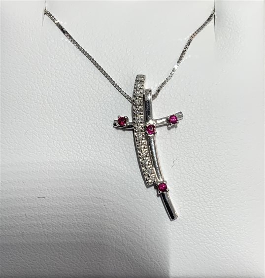 COLLANA CON CROCE IN ORO BIANCO CON 13 DIAMANTI 0.06 ct COLORE H E 4 RUBINI 0.06 ct