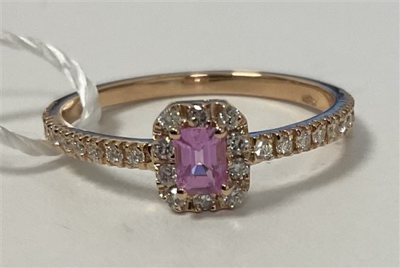 Anello in oro rosa con zaffiro rosa e diamanti bianchi.