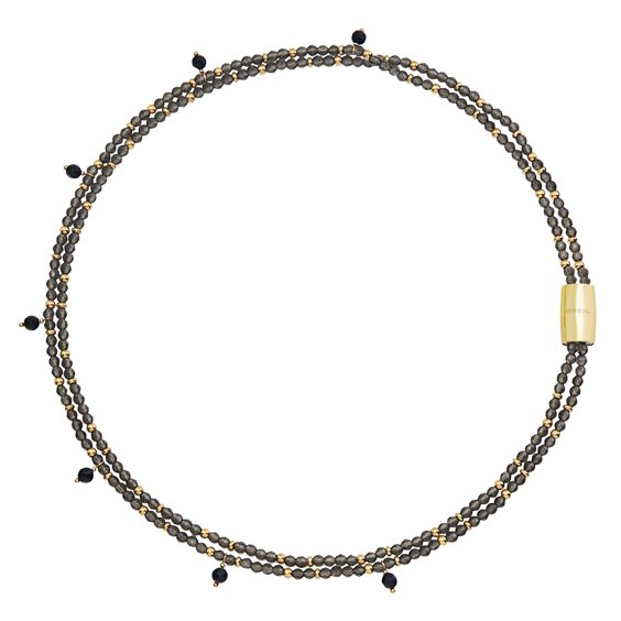 Il girocollo NY Skyline è composto da due catene di cristalli fumè con micro sfere in acciaio color oro e 7 charms in agata nera