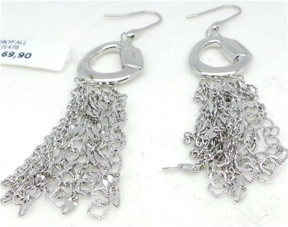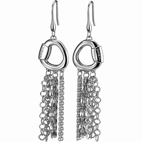 Orecchini pendenti in acciaio lucido formati dalla chiusura caratteristica della collezione e da piccole catenine di diverso stile.