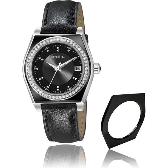 OROLOGIO BREIL SOLO TEMPO LADY CASSA IN ACCIAIO LUCIDO 34MM CON INSERTO IN POLICARBONATO HIGH TECH MILKY NERO. LUNETTA IN ACCIAIO CON CRISTALLI BIANCHI. CORONA CON CABOCHON MILKY NERO. QUADRANTE NERO. SFERE CON LUMINOUS. DATA. VETRO MINERALE. W.R. 10 ATM. CINTURINO IN PELLE NERA. CHIUSURA AD ARDIGLIONE IN ACCIAIO.