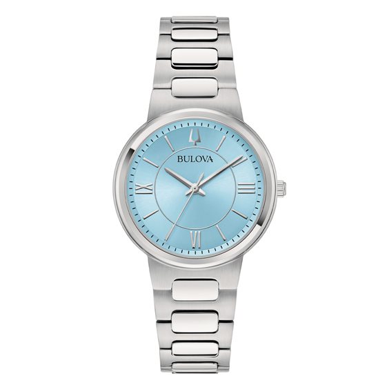 Orologio Bulova donna Solo Tempo. Cassa in acciaio lucido e spazzolato con bracciale integrato. Movimento al quarzo ore minuti secondi. Vetro minerale. Quadrante celeste, indici cifre romane lancette e logo lucide. Bracciale regolabile in acciaio lucido e spazzolato con chiusura deployante con pulsanti a scomparsa. Impermeabile 3 bar (atm).