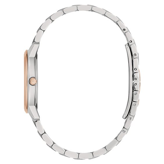 Orologio Bulova Donna Diamonds. Orologio solo tempo della collezione Bulova Sutton Diamond da donna. Colore cassa: argento; colore del quadrante: madreperla bianco; colore del bracciale: argento e pvd oro rosa. Cassa di diametro 31 mm in acciaio inossidabile 316L con trttamento pvd sulla ghiera e quadrante con datario e madreperla impreziosita da 3 diamanti incastonati a mano. Vetro minerale convesso. Bracciale bicolor in acciaio inossidabile 316L con trattamento pvd oro rosa e chiusura deployante. Movimento al quarzo. Classificazione di impermeabilità (WR) 3 ATM: resistente agli schizzi d’acqua ed alla pioggia, ma non sotto pressione. Bulova sinonimo di lusso raffinato e sofisticato minimalismo, con una forte ricerca della perfezione, efficienza e precisione. Garanzia 5 anni