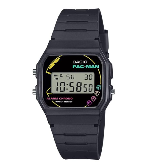 Presentiamo un'intera collezione di collaborazioni speciali per celebrare i 50 anni di orologi Casio quest'anno e prepararci al 45° anniversario di PAC-MAN del prossimo. Con disegni giocosi e un tocco nostalgico, questa linea dà vita al mondo di PAC-MAN, il popolarissimo gioco di Namco Bandai Entertainment. Un layout a caratteri cubitali con PAC-MAN e i quattro GHOSTS (Blinky, Pinky, Inky e Clyde) e una tavolozza di vivaci colori al neon conferiscono al design un'atmosfera pop. ""WAKA WAKA"" - il suono di PAC-MAN che mangia i biscotti - è scritto sull'anello del cinturino per un ulteriore tocco giocoso. Anche il fondello è inciso con il personaggio e il logo di PAC-MAN. Il cinturino è realizzato con resina a base biologica, un materiale ideato per contribuire a ridurre l'impatto ambientale. Viene fornito in una confezione speciale con un design al neon.