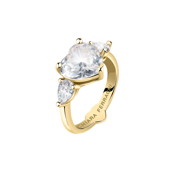 Anello trilogy chiara ferragni della collezione ’diamond heart’, ideale per esprimere i propri sentimenti. il gioiello è realizzato in lega speciale con placcatura oro e tre cristalli bianchi a forma di cuore.
