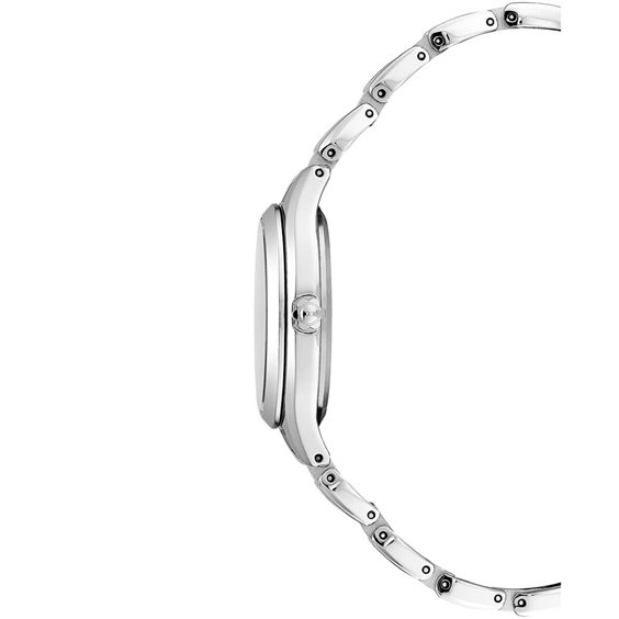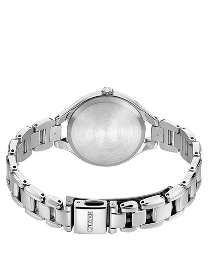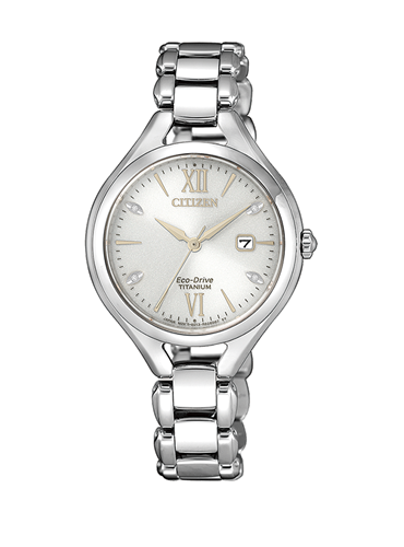 Orologio Citizen solo tempo da donna collezione Lady Super Titanio ref. EW2560-86A. Cassa realizzata in super titanio del diametro di 30 Mm. Quadrante bianco con datario a ore 3, cinturino in Super Titanio con finitura al platino. Vetro zaffiro. Quadrante con 4 diamanti incastonati. Movimento eco drive, con ricarica di sei mesi, resistente all'acqua 5 atmosfere. Chiusura con doppio pulsante.