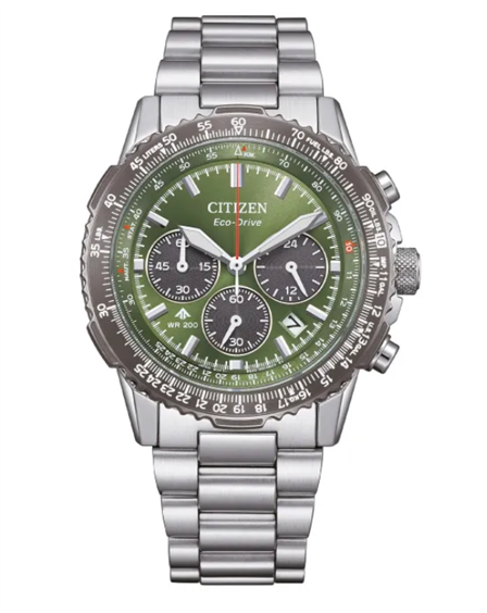 Orologio Cronografo Uomo Collezione Promaster Navihawk . Cassa in acciaio spazzolato con particolari lucidi , ghiera girevole con regolo calcolatore aeronautico , fondo a vite Movimento Eco-Drive cal. B620 cronografo con riserva di carica fino a 9 mesi. Resistenza magnetica di tipo 1 . Quadrante verde indici e lancette luminescenti. Vetro zaffiro antiriflesso . Bracciale regolabile in acciaio , chiusura deployante con pulsanti . Impermeabile 20 bar (WR 20 Atm.) Scatola e Libretto Istruzioni Originali. Garanzia 5 anni