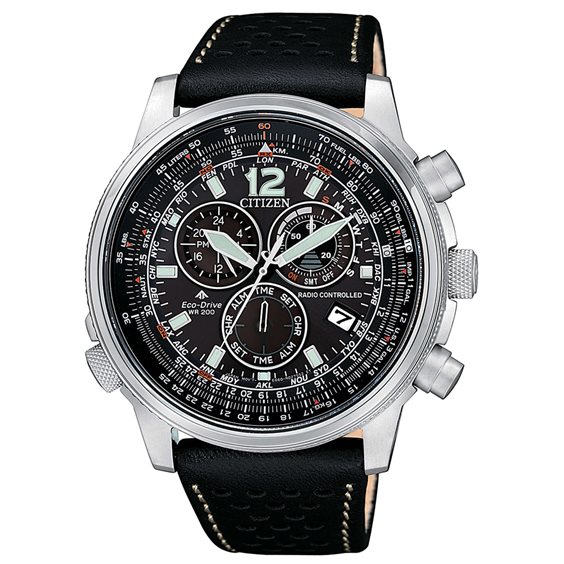 Orologio cronografo da uomo eco drive radiocontrollato, con cassa in acciaio del diametro di 44 Mm. Quadrante nero con datario, cinturino in pelle nero. Movimento eco drive, con Riserva di carica di 10 mesi (3 anni in funzione di risparmio energetico). Carica indicatore di prenotazione. Cronografo da 60 minuti a 1 secondo. Orologio 24 ore Calendario perpetuo fino al 28.2.2100. Funzione di ricezione delle onde radio con conferma acustica. Sistema di ricezione manuale e automatico, recupero automatico. Visualizzazione dello stato di ricezione. Compatibile con antenne provenienti da Giappone, Cina, Stati Uniti e Germania. World timer 24 fusi orari. resistente all'acqua 20 atmosfere.