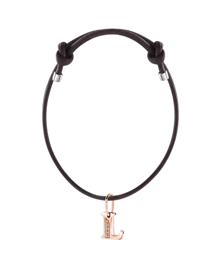 Ciondolo in oro rosa 9kt a forma di “L” con incastonati tre diamanti 0.01 ct. e fornito con cordino originale a braccialetto Damiani. Scatola e garanzia Damiani