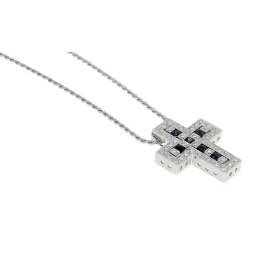 Collana della collezione Belle epoque con croce (23x19mm) in oro bianco con diamanti e zaffiri.