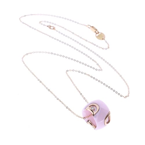 La collezione di gioielli D.Icon rappresenta l’ultima evoluzione di una lunga tradizione dei maestri orafi, che introducono la ceramica bianca, nera lucida e rosa nella lavorazione tradizionale dell’oro e dei diamanti creando una nuova iconica tendenza. Per contraddistinguere questi gioielli Damiani il logo, la D maiuscola, è rappresentata sulla ceramica in due modi, in oro pieno con diamante e in full pavé di diamanti bianchi. Le forme piene e facilmente riconoscibili degli anelli e pendenti sono enfatizzate dalla loro sezione bombata. collana in ceramica e oro rosa 18Ct, diamante round ct 0.011