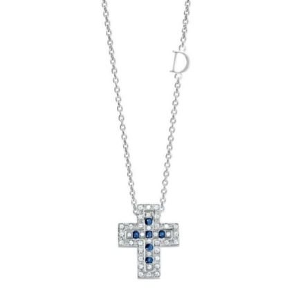 Damiani Belle Epoque è la collezione che si ispira all'eleganza dell'epoca parigina e alla femminilità, in cui i contrasti tra la brillantezza dei diamanti e il profondo colore delle pietre preziose come zaffiri, rubini e smeraldi danno vita a gioielli sorprendenti, raffinati e sofisticati. Il design della collezione Damiani Belle Epoque è moderatamente retrò reinterpretato in una chiave moderna, uno stile ever green, perfetto per la donna che ama il passato ma vive il presente, adora essere ammirata e desiderata, una donna che sfoggia fiera la sua femminilità. Elegantissima collana con pendente a forma di croce di diamanti e zaffiri ct 0,10