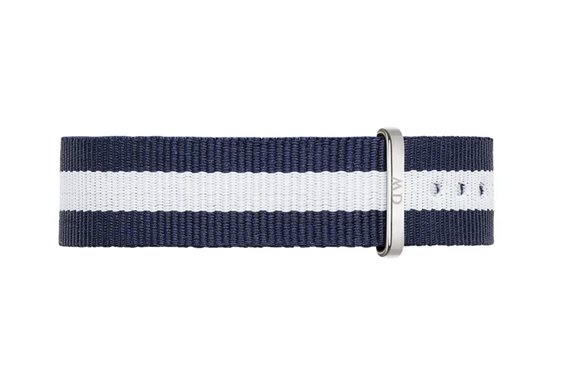 Cinturino in tessuto blu e bianco con fibbia color argento da 18mm.