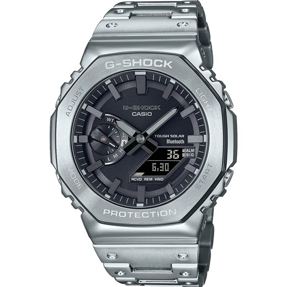 Bluetooth® Smart La speciale tecnologia Bluetooth® per il risparmio energetico garantisce lo scambio di dati a basso consumo con un semplice clic sull'apposito pulsante. Tramite Bluetooth® è possibile collegare l’orologio allo smartphone accedendo così ad una serie di funzioni utili desiderate. Smartphone time Se l'orologio è accoppiato allo smartphone, l'ora viene regolata automaticamente e visualizzare l'ora corrente in modo da tutto il mondo. Super illuminazione Antiurto Funzione solare Le celle solari alimentano l'orologio in modo autonomo ed ecologico. L'energia solare in eccesso viene salvata in una batteria. Neobrite Le lancette e/o le cifre hanno un rivestimento fluorescenti e si illuminano al buio dopo lo spegnimento di una fonte luminosa Funzione ora mondiale Cronometro - 1/100 sec - 24 ore Timer - 1/1 sec. - 24 ore 5 allarmi giornalieri Attivazione/disattivazione del suono dei tasti Funzione di spostamento delle lancette Ricerca telefono Non trovate più lo smartphone? Basta premere un pulsante dell'orologio e lo smartphone emette un segnale acustico. Indicazione del giorno settimanale in parecchie lingue L'indicazione del giorno settimanale può essere selezionata in diverse lingue. Calendario automatico Formato 12/24 ore. Vetro minerale Cassa in acciaio inox trattamento al carbonio finitura IP acciaio Bracciale in acciaio inox trattamento al carbonio finitura IP acciaio Classificazione di impermeabilità (20 bar) Perfetto per l'immersione in apnea senza attrezzatura: l'orologio è impermeabile fino a 20 bar (ISO 22810). Dimensioni (A x L x P) 48,6mm x 45,5mm x 11,9mm Peso ca. 52 g