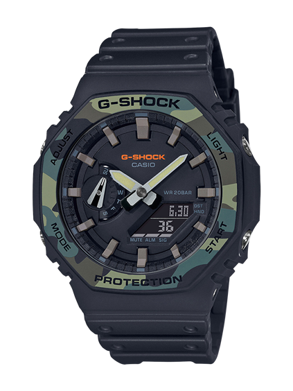Orologio G-Shock collezione Carbon core guard, cassa in resina nera con ghiera mimetica, lancette grigie luminose, dual time con quadrante digitale ad ore 3/6 con datario. Doppio led, allarme giornaliero, fuso orario, cronometro, calendario, Timer, anti shock, water resistant 200 mt. Cinturino in resina nera.