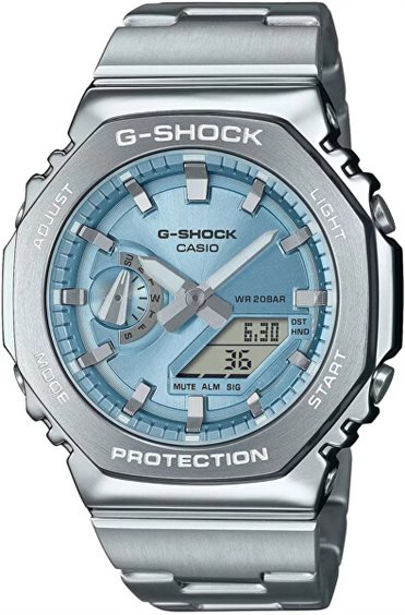 Ti presentiamo il nuovo GM-2110D, una combinazione analogico-digitale G-SHOCK basata sulla cassa GA-2100, ora con un'elegante cassa in metallo e un bracciale tutto nuovo. Forgiata e lucidata meticolosamente, la cassa ottagonale uniforme in acciaio inossidabile è parte fondamentale di un design semplice e senza fronzoli, con un look sofisticato e allo stesso tempo resistente. Realizzata in resina rinforzata con fibra di vetro ad alta rigidità, la cassa è la più sottile di tutti i modelli combinati G-SHOCK, con soli 11,8 mm. Il bracciale in metallo, insieme a un tocco di colore fresco del quadrante in ottone metallico, è ideale per qualsiasi attività: lavoro o gioco. È possibile scegliere tra blu cielo, arancione o verde lime, oltre alle classiche tonalità navy e argento. Il tutto con una doppia luce LED ad alta luminosità, per una facile lettura anche al buio.