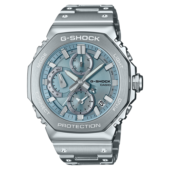 Il primo cronografo G-SHOCK, GMC-B2100AD-2A, completamente in acciaio e con cassa ottagonale. Nuovo arrivato nella linea di orologi 2100 in continua evoluzione. Tra la lunetta e la cassa, sono installati componenti di stabilizzazione in resina fine per ottenere una struttura resistente agli urti con una superficie esterna completamente in metallo. La lunetta, la cui forma tridimensionale è frutto di un lungo processo di forgiatura, taglio e lucidatura, è rifinita con un trattamento circolare a linea sottile sulla superficie superiore e una lucidatura a specchio sui lati inclinati. Le tecnologie di lavorazione ad altissima precisione di Casio, quali la delicata sagomatura e la deposizione al vapore, aggiungono raffinatezza e qualità agli indicatori e agli anelli del quadrante incassato. La corona con blocco a vite è progettata nella stessa forma ottagonale della lunetta per una cassa più compatta senza sacrificare l'eccezionale resistenza agli urti di G-SHOCK. Il montaggio ad alta densità mantiene sottile il modulo, fornendo contemporaneamente le avanzate funzioni apprezzate in un profilo compatto e una vestibilità confortevole. Si può associare allo smartphone tramite Bluetooth®. È sufficiente toccare l'app dedicata per mantenere la regolazione precisa dell'orario e tenere il passo con i tempi. Con Tough Solar, una luce LED ad alta luminosità e una gamma di altre funzioni pratiche, questo orologio offre uno stile stupendo e notevole praticità.