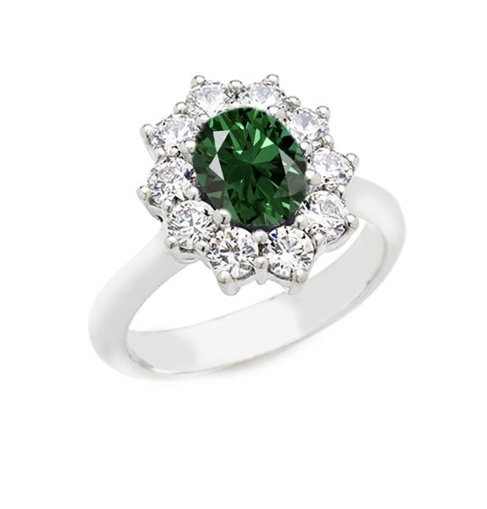 Anello in oro bianco 18 KT con smeraldo naturale di taglio ovale 8x6 e 10 diamanti bianchi qualità G-Si per una caratura totale di 0.87 ct.