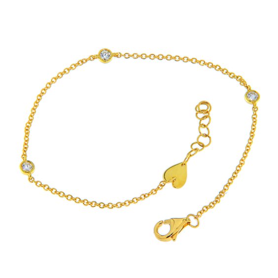 Bracciale in oro giallo 18 KT con 3 diamanti bianco qualità G-Si da 0.05 ct per una caratura totale di 0.15 ct - La misura polso è regolabile da 15.5 a 17.5 cm. Il cuoricino sul finale è personalizzabile con incisione.