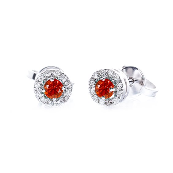 Paio di orecchini in oro bianco 18 KT peso complessivo circa 1 gr con 2 rubini naturali a taglio rotondo da 0.09 ct e 24 diamanti bianchi