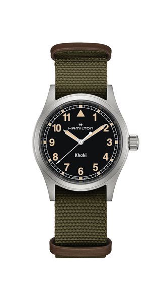 Il Khaki Field Quartz incarna la tradizione militare Hamilton tramite la semplicità del suo design. Sul quadrante spicca un font chiaro con numeri arabi ben dritti e una minuteria a binario. La palette cromatica è sobria: un quadrante nero raffinato messo in risalto da indici in Super-LumiNova® color rodio anticato. Perfetto per le tue avventure all'aria aperta, l'orologio è provvisto di un cinturino verde in tessuto NATO con passanti in pelle marrone.