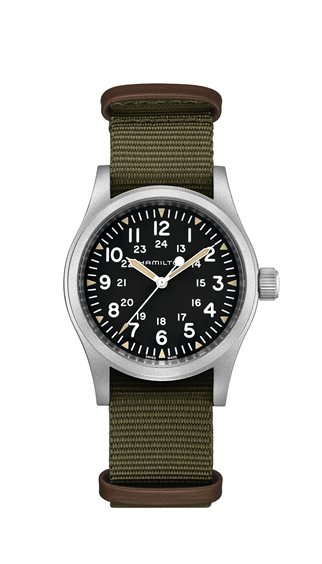 Hamilton Khaki Fiedl Mechanical 38 MM H69439931 - Il modello Hamilton Khaki Field Mechanical H69439931 attirerà soprattutto gli amanti dello stile militare. Il design dell'orologio si riferisce alla collaborazione del marchio con l'esercito americano. Il nuovo Khaki Field Mechanical è una copia fedele del suo predecessore originale degli anni '60 ed è fedele alla tradizione militare di Hamilton. Questo è l'orologio originale di ispirazione militare, costruito per durare. L'intera linea Khaki Field si concentra su un'ottima leggibilità, che era la cosa più importante per l'uso militare. Gli orologi Khaki Field sono realizzati per gli avventurieri nella vita e sono garantiti per soddisfare le tue esigenze sul campo. All'interno della cassa, il movimento è meccanico svizzero Hamilton H-50 (basato sull'ETA 2801-2) a carica manuale. Funziona ad una frequenza di 21.600 semifrequenze all'ora, dispone di 25 pietre e, soprattutto, di una riserva di marcia estesa di 80 ore. La cassa in acciaio dell'orologio è completata da un cinturino NATO in tessuto verde. Il modello si distingue per l'eccellente leggibilità e la facile chiarezza, richieste negli orologi militari. Il quadrante, che nella sua forma non rinnega il modello militare, è protetto da un vetro zaffiro antigraffio. Le lancette e gli indici sono rivestiti con composto luminescente Superluminova, che garantisce una luminosità più lunga. Il diametro della cassa di 38 mm rende l'orologio indossabile sulla maggior parte dei polsi maschili. La resistenza all'acqua dell'orologio è di 50 m (5 ATM), quindi può sopportare il contatto di base con l'acqua, come la pioggia o un acquazzone. Presente in Sonic - Il film (2020). Indossato da Tom Wachowski, interpretato da James Marsden.