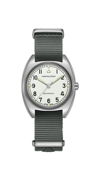 Hamilton Aviation Pilot Pioneer meccanico H76419951 L' Hamilton Khaki Aviation Pilot Pioneer Mechanical H76419951 è una reinterpretazione dello storico orologio militare realizzato per la Royal Air Force britannica nel 1973. Con il suo design distintivo del quadrante e il robusto cinturino NATO, questo orologio è un orologio militare con vero carattere. All'interno della cassa, il movimento meccanico svizzero Hamilton H-50 (basato sull'ETA 2801-2) a carica manuale ticchetta in modo affidabile. Funziona a una frequenza di 21.600 semi-frequenze all'ora, ha 17 rubini e, soprattutto, una riserva di carica estesa di 80 ore . L'orologio resta al polso grazie al cinturino NATO in tessuto grigio ben lavorato con fibbia argentata. Il modello si distingue per la sua eccellente leggibilità e la sua facile chiarezza, che è richiesta per gli orologi da aviazione. Il quadrante bianco è protetto da un vetro minerale . Le lancette e gli indici sono rivestiti con un composto luminescente, che garantisce una luminosità più duratura e una migliore leggibilità anche in condizioni di scarsa illuminazione. La dimensione della cassa di 36 x 33 mm rende l'orologio indossabile sulla maggior parte dei polsi maschili e femminili. La resistenza all'acqua dell'orologio è di 100 m (10 ATM) , quindi può sopportare un contatto con l'acqua ancora maggiore, come il nuoto.