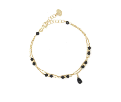 Bracciale in argento 925 placcato oro 23kt con pietre di spinello disposte in doppio filo a gruppi di due, arricchito da una raffinata goccia di spinello al centro. Perfetto per un tocco di eleganza e luminosità, abbinalo a un outfit semplice per far risplendere i dettagli. Lunghezza: 16 cm + 3 cm di allungo