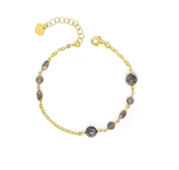 Bracciale in argento 925 placcato oro 23kt, con pietre di labradorite. ELISAVET è una collezione che dona eleganza e forza naturale al tuo look. LUNGHEZZA: 16 cm + 3 cm di allungo