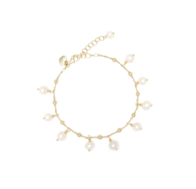Bracciale in argento 925 placcato oro 23kt, arricchito da perle di fiume bianche, per un look delicato ed elegante. Perfetto per aggiungere un tocco di raffinatezza al tuo stile. LUNGHEZZA: 16 cm + 3 cm di allungo.