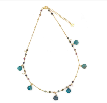 Collana in argento 925 placcato oro 23kt è un gioiello vivace, arricchito dalle pietre di apatite, tormalina multicolor e labradorite bianca. Un'armonia di colori che dona un tocco di energia e freschezza al tuo look. Lunghezza: 38 cm + 5 cm di allungo