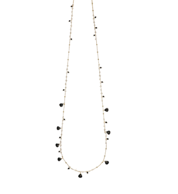 Collana lunga in argento 925 placcato oro 23kt con spinello e perle naturali. Un gioiello sofisticato e versatile, che abbina la lucentezza della perla all’intensità dello spinello, per un effetto elegante e senza tempo. Lunghezza: 80 cm + 5 cm