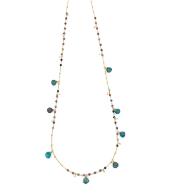 Collana lunga in argento 925 placcato oro 23kt con pietre di apatite, tormalina multicolor e labradorite bianca, un gioiello vivace e unico che aggiunge colore e luminosità al tuo look. Perfetta per un tocco di originalità e stile. Lunghezza: 80 cm + 5 cm di allungo