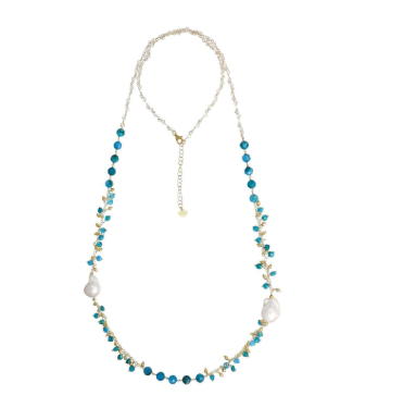 Collana lunga in argento 925 placcato oro 23kt, con pietre di apatite alternate a nodini dorati lungo una catena a forma di cuoricini. Due perle barocche adornano i lati della parte centrale, aggiungendo un tocco di eleganza e unicità al design. Un accessorio perfetto per chi ama brillare con uno stile raffinato e sofisticato. Lunghezza: 85 cm + 5 cm di allungo
