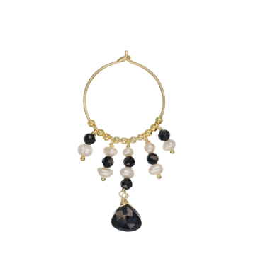 Orecchino singolo a cerchio in argento 925 placcato oro 23kt con spinello e perle. Moderno e chic, pensato per chi ama i dettagli luminosi e versatili.