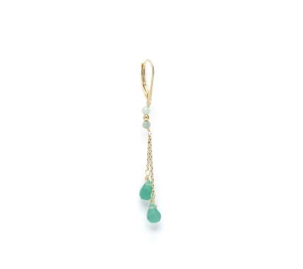 Orecchino in argento 925 placcato oro 23kt con pietre di smeraldo disposte in gruppi di due, arricchito da una raffinata goccia di agata al centro.