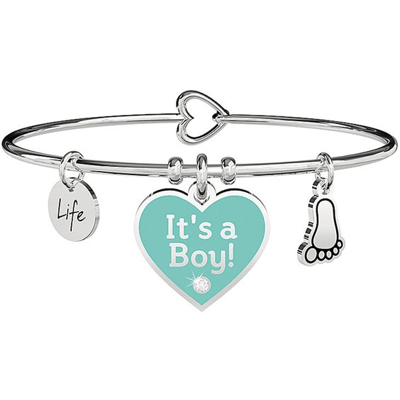 Bracciale bangle in acciaio 316L, circonferenza 20 cm, Ø 6 cm con ciondolo piedino e ciondolo cuore smaltato, cristallo bianco.. Scritta: It's a Boy! Dimensioni: ciondolo cuore 19x19 mm, ciondolo piedino 8x10.50 mm, cristallo Ø 2 mm