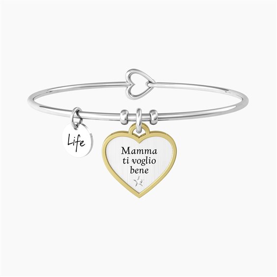 Bracciale bangle in acciaio 316L, circonferenza 20 cm, Ø 6 cm con ciondolo cuore satinato e con PVD giallo lucido, cristallo. Scritta: Mamma ti voglio bene... me. Dimensioni: ciondolo 19x19 mm, cristallo: Ø 1.5 mm