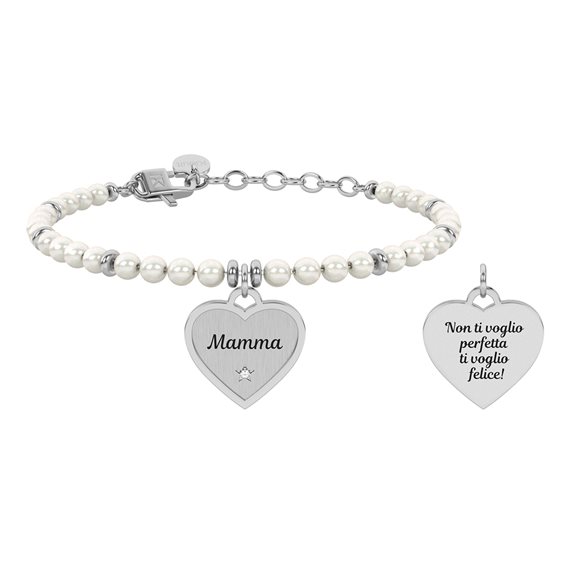 Bracciale in acciaio 316L lucido e satinato, lunghezza regolabile da 16 a 19 cm, con perle conchiglia, ciondolo cuore e cristallo. Scritta: Mamma Non ti... felice!. Dimensioni: perle conchiglia Ø 4 mm, cuore 17x17.5 mm, cristallo Ø 1.5 mm