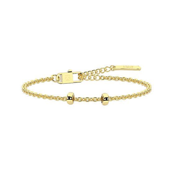 Bracciale in acciaio 316L e PVD giallo, lunghezza regolabile da 15.5 a 18.5 cm, con catena rolò, stopper con silicone. Dimensioni: stopper Ø 5 mm, catena 2 mm