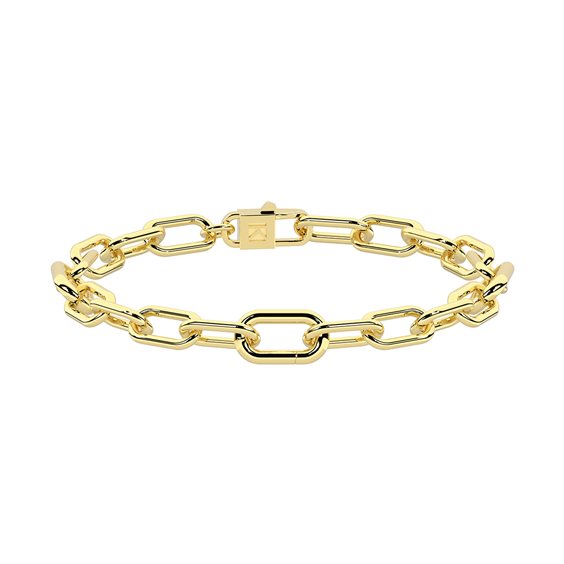 Bracciale in acciaio 316L e PVD giallo, lunghezza 18.5 cm, con catena allungata e tre link apribili. Dimensioni: catena 6 mm, link Ø 7.5 mm