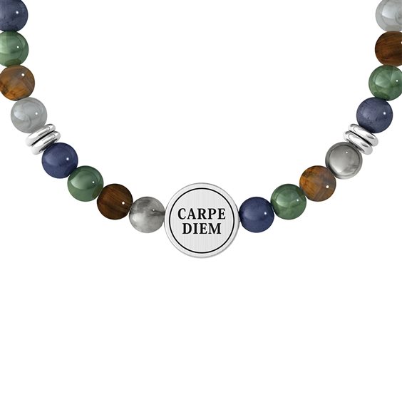 Bracciale elastico in acciaio 316L, con pietre alternate multicolore, circonferenza 19.50/19.80 cm, ciondolo con cristallo nero. Scritta: CARPE DIEM. Dimensioni: ciondolo Ø 12 mm, sfere Ø 6 mm, cristallo Ø 2 mm.
